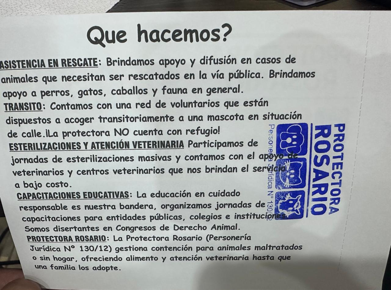 La Protectora Rosario (Personería Jurídica Nº 130/12) gestiona contención para animales maltratados o sin hogar, ofreciendo alimento y atención veterinaria hasta que una familia los adopte.